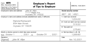 Debe comunicar mensualmente sus propinas a la empresa mediante el formulario 4070.   Todas las propinas recibidas también deben ser declaradas al IRS en su declaración de impuestos.